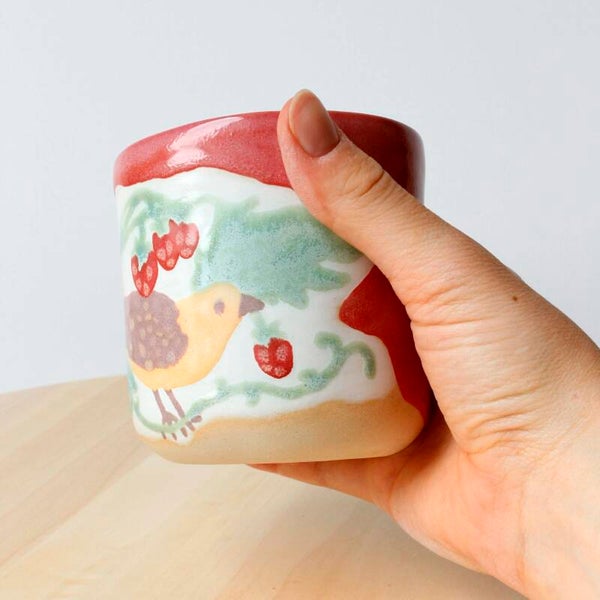 This hand-cast and hand-painted cup is inspired by the beautiful illustrations of William Morris and the strawberries growing in my garden.